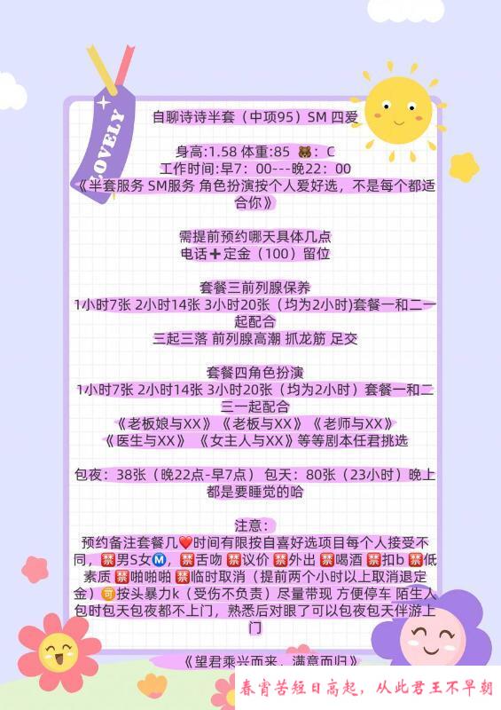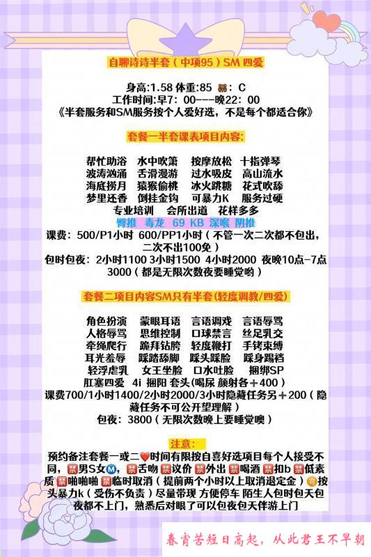 服务项目: 助浴 花式调情 花式舔 吹 含 舔 深 花样多多 毒龙 69 深喉 回龙啸 水中啸 口爆 倒挂金钩……